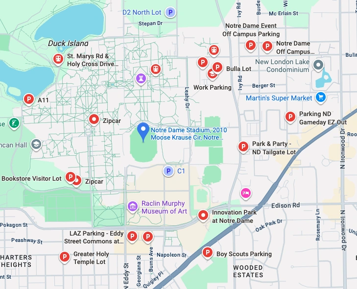 Bus Lot (Innovation Park) | Bus | $300 | Located off SR 933, east on Angela Boulevard, past Eddy Street & Fairfield Inn on the right side. Across from Harris Family Track and Field Stadium. | Groups with 5 or more buses should call Murnane Family Ticket Office at 574-631-7356 in advance. Parking services staff cashier and assist with parking. |